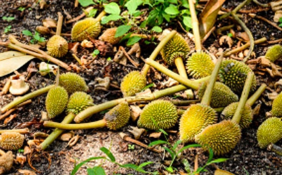 Sầu riêng bị sốc nhiệt gây ra hiện tượng rụng trái non hàng loạt. Ảnh: Công Hoàng.