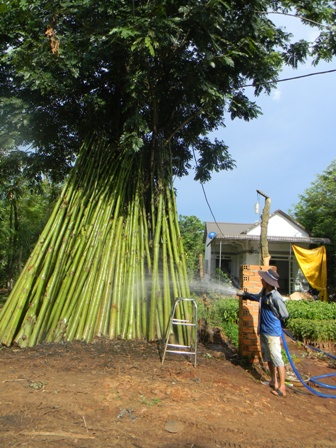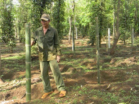 Không ít hộ đã dùng cây tre làm trụ trồng tiêu cho kịp thời vụ do không đủ điều kiện mua trụ gòn hoặc trụ bằng bê tông.
