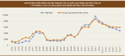 Cụ thể, ở thời điểm năm 2011, với mức giá xuất khẩu 5.913 đô la Mỹ/tấn, giá của nước ta chỉ cao hơn 368 USD/tấn và 6,6% so với giá bình quân của 35 quốc gia khác. Còn ở thời điểm giá hồ tiêu thế giới đạt kỷ lục mọi thời đại (2015), khoảng cách này lên tới mức kỷ lục 944 USD/tấn và 10,9%.