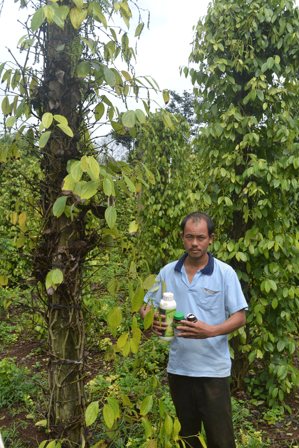 Ngày 17-9, sau khi dẫn chúng tôi đi thực tế vườn tiêu bị hư hại, ông Trần Đức Vinh đã đưa ra các vỏ chai thuốc BVTV, các giấy tờ có liên và kể rằng: Ngày 8-9-2016, ông ra Cửa hàng thuốc BVTV của Công ty TNHH Dũng Khánh Hiền (ở số 351, đường Lê Duẩn, TP. Pleiku) mua 3 lọ thuốc Vigor 32sl và 14 chai thuốc Cup 2.9 đều dán nhãn hiệu Công ty cổ phần Ni Việt (ở số 52, đường Nguyễn Văn Cừ, phường Thảo Điền, quận 2, TP. Hồ Chí Minh). Tổng số tiền mua số thuốc trên là 1.410.000 đồng. Ngày 10-9, gia đình ông đem các loại thuốc này ra vườn pha chế và phun cho 600 trụ tiêu theo đúng hướng dẫn của người bán và đúng hướng dẫn kỹ thuật pha chế nồng độ liều lượng in tại bao bì sản phẩm các loại thuốc BVTV này. Đến chiều 12-9, ông phát hiện thấy lá tiêu đồng loạt héo rũ, ngọn tiêu teo tóp lại, quả rơi rụng dần. Sáng 13-9, thấy vô số cành tiêu rơi rụng dưới gốc, gia đình ông liền chạy đi báo tin. Ngay sau đó, cán bộ các cấp, đại diện Cửa hàng bán thuốc BVTV-ông Nguyễn Hoài Sơn và đại diện Công ty cổ phần Ni Việt-ông Nguyễn Quốc Huy đã tới hiện trường lập biên bản, hỗ trợ phun thuốc giải độc 5 triệu đồng, nhưng gia đình ông không nhận. Tuy vậy, gia đình ông vẫn tích cực phối hợp với các kỹ thuật viên của Công ty cổ phần Ni Việt dùng thuốc Dong biển giải độc phun cho cây tiêu. Kết quả đến cuối ngày 16-9, vườn tiêu mới ngừng rụng cành và đã có những biểu hiện hồi phục xanh tươi trở lại.